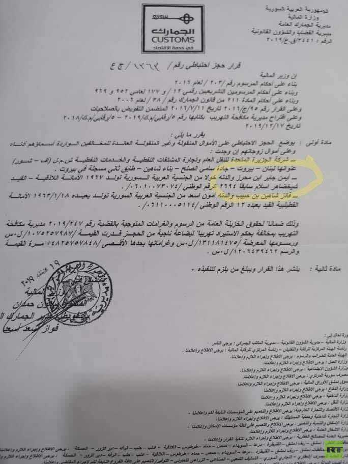وفي حيثيات القرار أنه جاء ضمانا لحقوق الخزينة العامة من رسوم وغرامات مترتبة بقضية رقم 247/2019، مديرية مكافحة التهريب، وبسبب مخالفة "بحكم الاستيراد تهريبا لبضاعة ناجية من الحجز" قدرت قيمتها بما يزيد عن مليار ليرة، وبلغت رسومها نحو 131 مليون ليرة، والحد الأقصى لغراماتها 4.8 مليار ليرة.