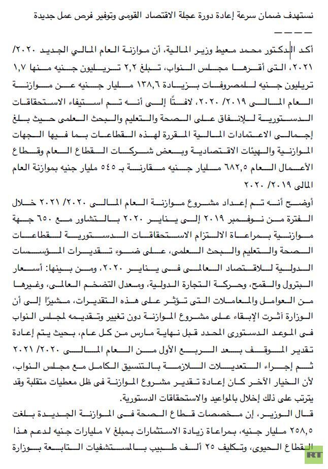 أعلن وزير المالية المصري محمد معيط، أن الموازنة العامة التي أقرها مجلس النواب لعام 2020/2021 تبلغ 2.2 تريليون جنيه، وهي أكبر موازنة في تاريخ البلاد.