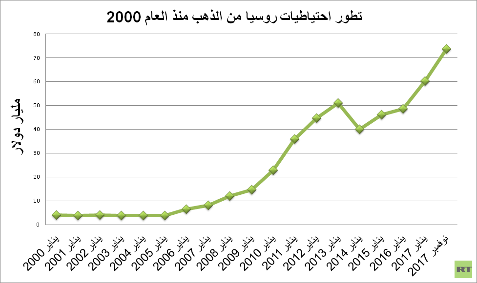 بلغت قيمة احتياطيات روسيا من الذهب مطلع نوفمبر/تشرين الثاني الجاري ما يقارب 74 مليار دولار، مرتفعة بنسبة 22% منذ مطلع العام الجاري.