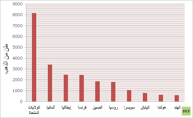 في حين، تصدرت الولايات المتحدة دول العالم باحتياطيات تبلغ 8133.5 طن، تليها ألمانيا باحتياطيات 3373 طن، ومن ثم في المرتبة الثالثة إيطاليا بـ2451.8 طن.