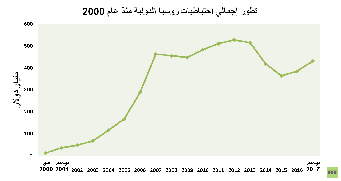 ما يعني أن اجمالي الاحتياطيات الدولية زادت بنسبة 12% خلال 2017. وبلغت احتياطيات روسيا أعلى مستوياتها في أغسطس/اَب 2008، حيث وصلت 598 مليار دولار.