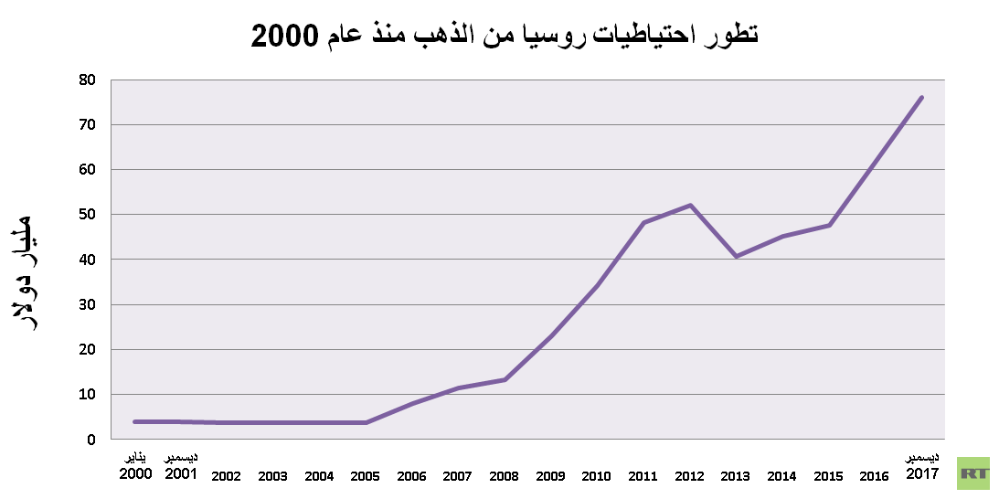 فيما، صعدت احتياطيات الذهب من 60.194 مليار دولار سجلتها بتاريخ 1 يناير/كانون الثاني 2017، إلى 76.118 مليار دولار في ديسمبر/كانون الأول، أي أن احتياطيات المعدن النفيس ارتفعت بمقدار 15.924 مليار دولار أو 26.4%.