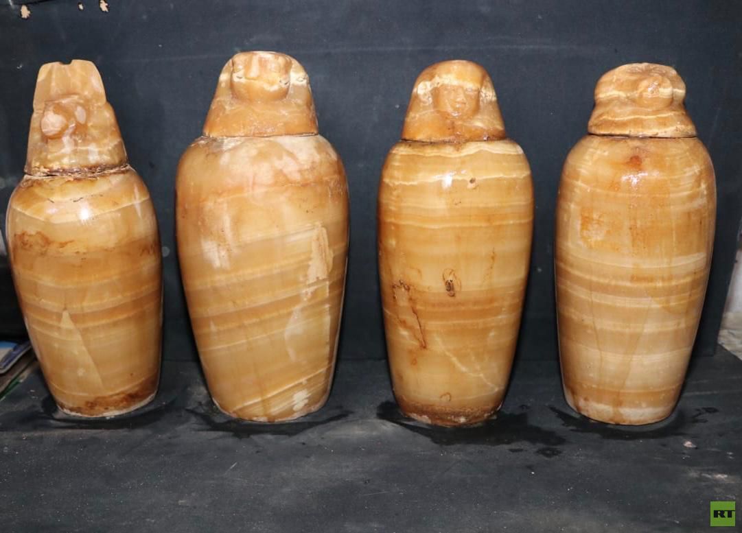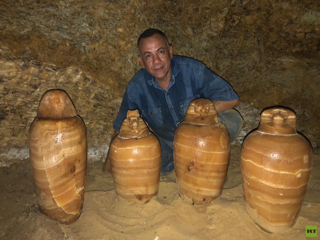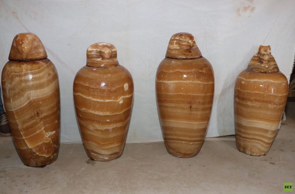 وأوضح الأمين العام للمجلس الأعلى للآثار في مصر ورئيس البعثة مصطفي وزيري، أن "المقبرة تتكون من بئر للدفن بعمق 10 أمتار، يؤدي إلى حجرة كبيرة بها خزانات محفورة في الصخر مغلقة بألواح حجرية منتظمة الشكل، عثر بداخلها على تمثالين من الحجر الجيري، أحدهما على هيئة العجل أبيس والثاني لسيدة، بالإضافة إلى أوان كانوبية من أجمل الأواني التي تم العثور عليها، مصنوعة من الألبستر على هيئة أبناء حورس الأربعة نقش عليها ألقاب وأسماء المتوفى".
