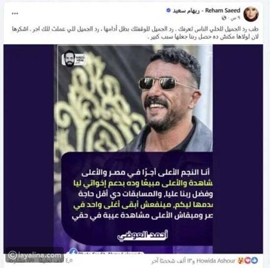 ووجهت ريهام سعيد رسالة مباشرة إلى أحمد العوضي عبر حسابها على "فيسبوك"، طالبت خلالها بضرورة رد الجميل لمن ساندوه في بداياته، قائلة: طب رد الجميل للي خلى الناس تعرفك، رد الجميل للي وقفتك بطل قدامها، رد الجميل للي عملت لك أجر، اشكرها لأن لولاها ما كانش ده حصل، ربنا جعلها سبب كبير.