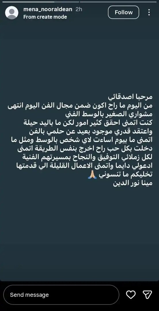 وجاء الإعلان عبر تدوينة على حسابها الرسمي في "إنستغرام" حيث أكدت توقفها عن الاستمرار في الوسط الفني بقولها: "اليوم انتهى مشواري الصغير بالوسط الفني"، وهو ما فتح باب التساؤلات لدى متابعيها.