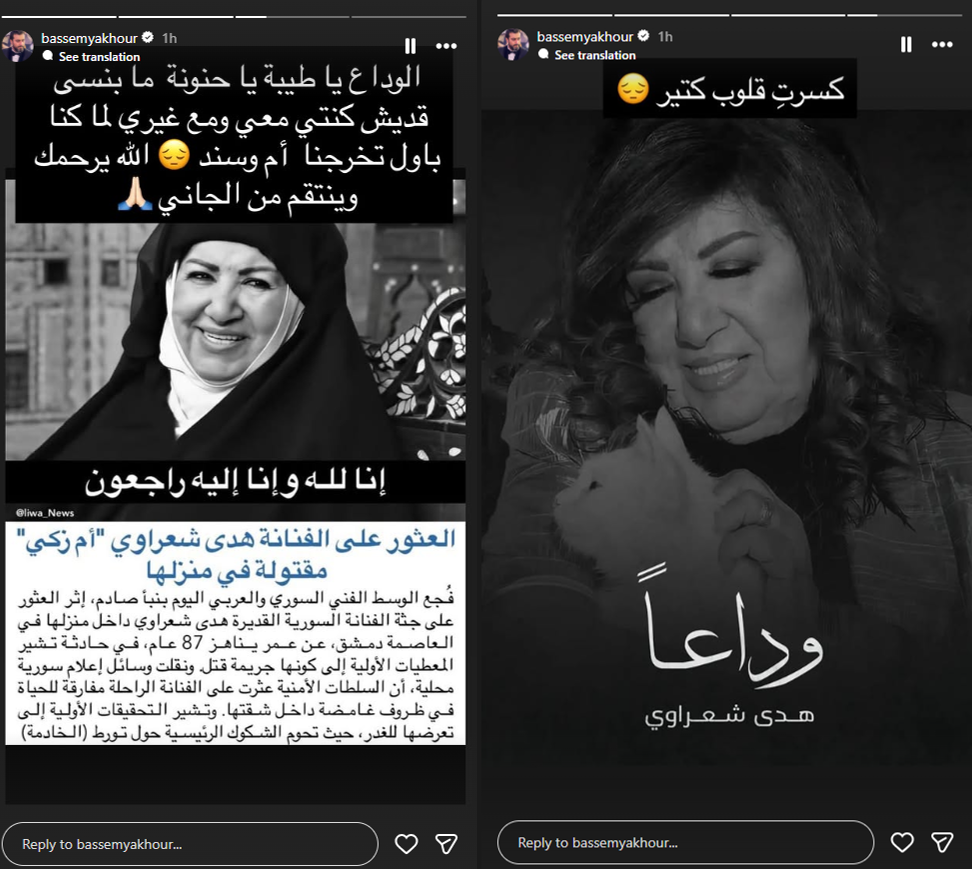 مقتل الممثلة السورية هدى شعراوي المعروفة بدور "أم زكي" داخل منزلها في العاصمة دمشق