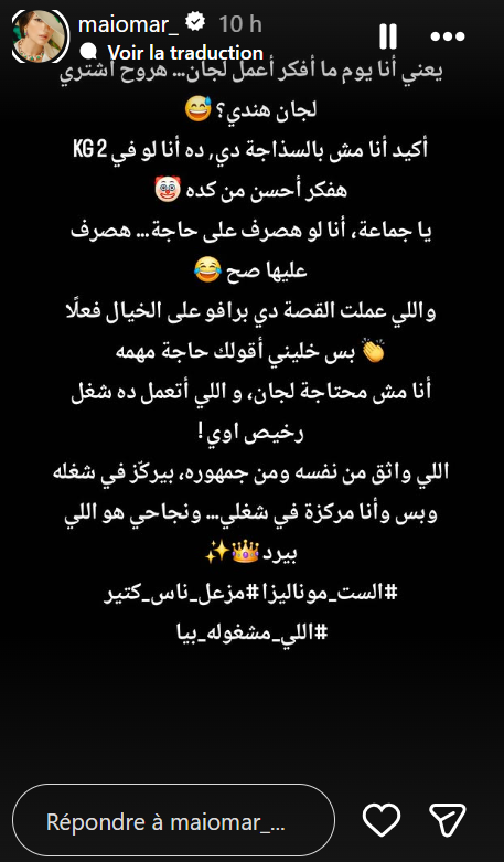 وقالت مي عمر في رسالتها: "يعني أنا يوم ما أفكر أعمل لجان.. هروح أشتري لجان هندي؟ أكيد أنا مش بالسذاجة دي.. ده أنا لو في KG2 هفكر أحسن من كده يا جماعة، أنا لو هصرف على حاجة هصرف عليها صح.. واللي عملت القصة دي برافو على الخيال فعلًا بس خليني أقولك حاجة مهمة.. أنا مش محتاجة لجان، واللي أتعمل ده شغل رخيص اوي! اللي واثق من نفسه ومن جمهوره، بيركز في شغله وبس وأنا مركزة في شغلي.. ونجاحي هو اللي بيرد.. الست موناليزا مزعل ناس كتير.. اللي مشغولة بيا".