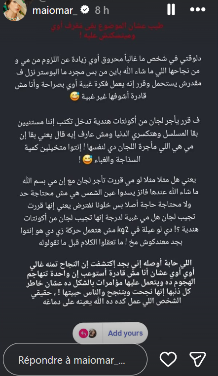 ويبدو أن هذه الاتهامات أغضبت مي، مما جعلها تخرج عن صمتها برسالة قوية عبر حسابها على "إنستغرام"، حيث أكدت أنها لا تحتاج لمثل هذه الأمور للدعاية لنفسها أو لإثبات شعبيتها، وسخرت من الفكرة ووجهت اتجاها إلى شخصية مجهولة تحاول محاربتها والتقليل من نجاحها، ثم أعادت نشر رسائل من جمهورهم هاجموا فيها إحدى الفنانات بسبب محاربتها لمي عمر منذ الإعلان عن المسلسل.
