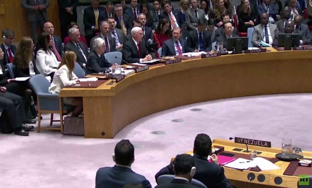 دعا نائب الرئيس الأمريكي مايك بنس خلال جلسة في مجلس الأمن حول فنزويلا دعا الأمم المتحدة للاعتراف بزعيم المعارضة الفنزويلية خوان غوايدو رئيسا