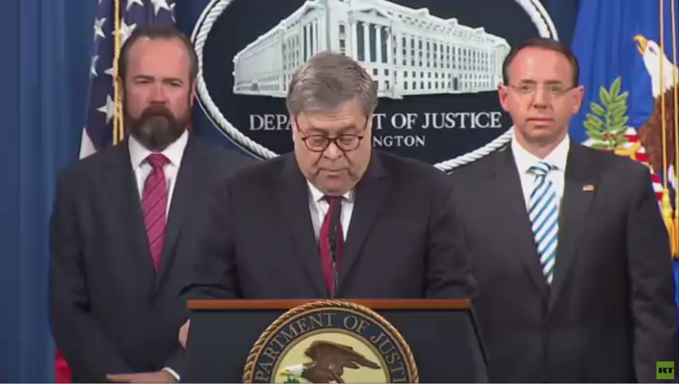 أكد وزير العدل الأمريكي وليام بار أن نتائج تقرير المحقق مولر بشأن مزاعم التدخل الروسي في حملة الرئيس ترامب لم تتوصل إلى أي دليل على وجود تواطؤ بين عملاء روس وفريق ترامب الانتخابي..