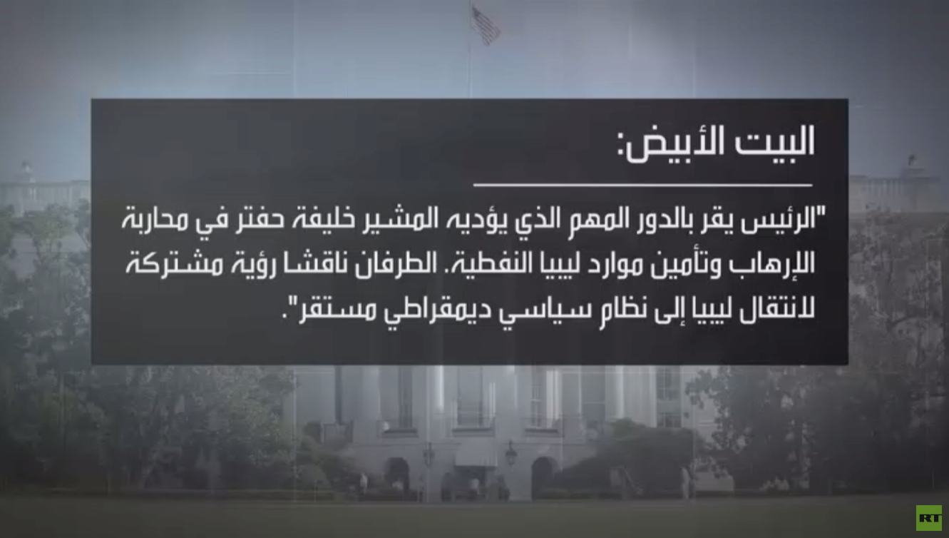 أعلن البيت الأبيض في بيان أن الرئيس الأمريكي دونالد ترامب أقر بدور قائد الجيش الليبي المشير خليفة حفتر في مكافحة الإرهاب وتأمين موارد ليبيا النفطية..