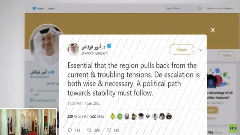 دعا وزير الدولة الإماراتي للشؤون الخارجية أنور قرقاش إلى تهدئة التوترات وخفض التصعيد في المنطقة، وذلك بعد استهداف إيران قاعدتين أمريكيتين في العراق.