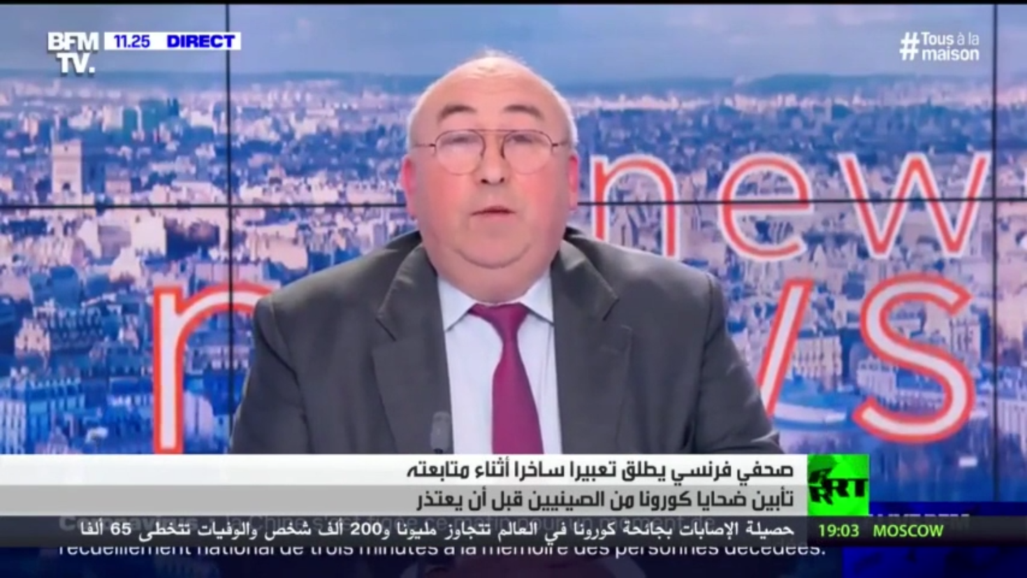 قدم صحفي فرنسي اعتذاره عقب تعبير ساخر أطلقَه على الهواء، يخص مراسمَ تأبين لضحايا فيروس كورونا من الصينيين،