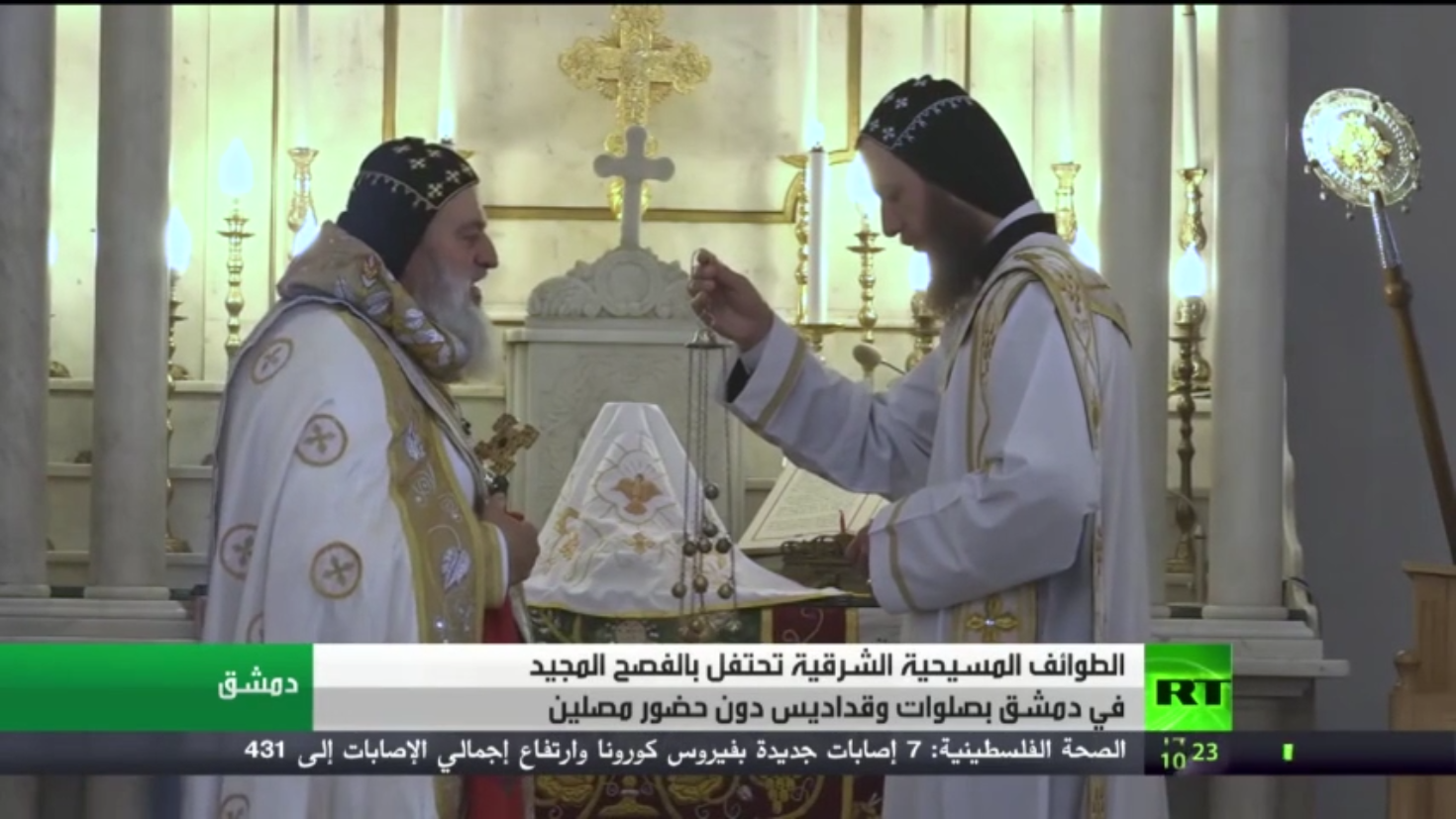 أحيت الطوائف المسيحية الشرقية عيد الفصح المجيد في دمشق بقداديس دون حضور المصلين، بسبب الإجراءات الاحترازية ضد فيروس كورونا في سوريا.