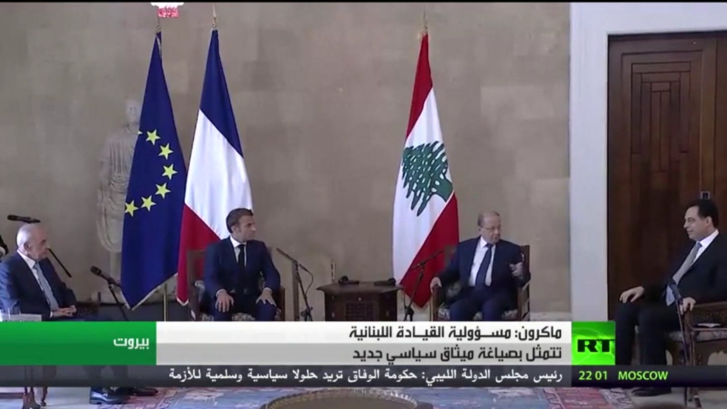 وقال ماكرون في مؤتمر صحفي عقب لقاءات عقدها مع الرؤساء الثلاثة، وقادة الكتل البرلمانية في لبنان، إنه طالب المسؤولين بنظام سياسي، تكون الوحدةُ الوطنية أساسَه، إضافة إلى صياغة ميثاق سياسي جديد.