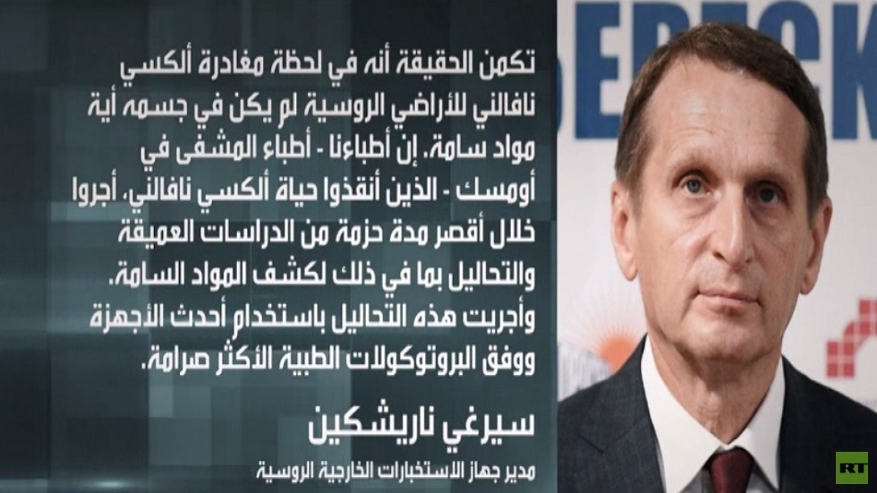 وشدد ناريشكين، على أن جسم الناشط المعارض الروسي أليكسي نافالني كان خاليا من أي مواد سامة، عندما غادر روسيا إلى ألمانيا على متن طائرة خاصة. من جهته أكد المتحدث باسم الكرملين دميتري بيسكوف، تعليقا على تصريح، نافالني حول نيته العودة إلى روسيا، بأن أي مواطن حر في المغادرة والعودة إلى وطنه.