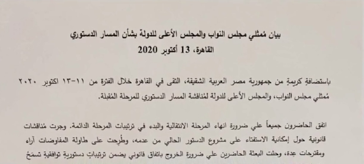 انتهت في القاهرة اجتماعات وفدي مجلسِ النواب الليبي والمجلس الأعلى للدولة، لبحث المسار الدستوري، حيث اتفق الجانبان على العودة إلى العاصمة المصرية لاستكمال المشاورات.