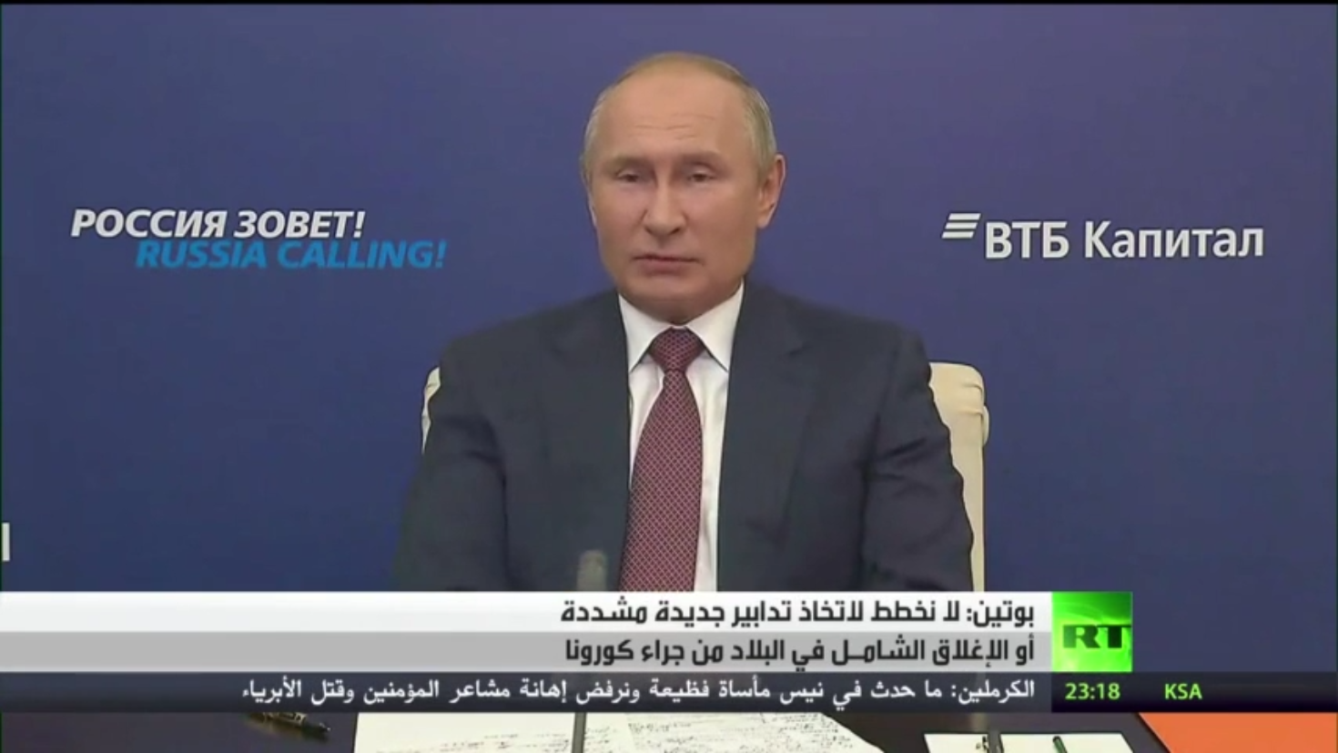 أعلن الرئيس الروسي فلاديمير بوتين أن الخطط الحالية لا تشمل فرض إغلاق شامل للبلاد جراء انتشار فيروس كورونا، مشيرا إلى أن الإجراءات المتخذة خففت تبعات الوباء على الاقتصاد الوطني.