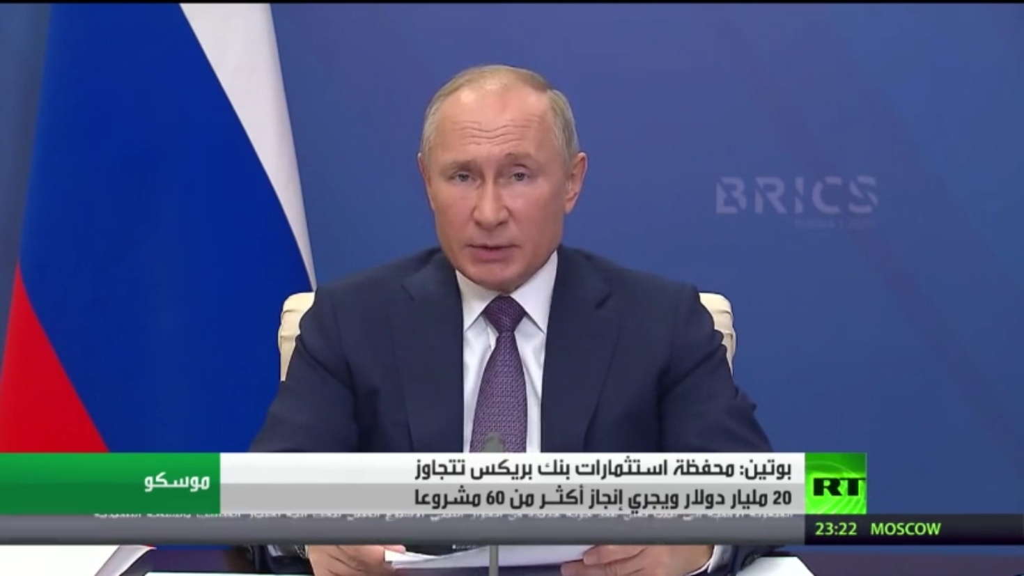 قال الرئيس الروسي فلاديمير بوتين في كلمة أمام قادة بريكس عبر الفيديو إن محفظة المشاريع الاستثمارية لمصرف بريكس تتجاوز الان 20 مليار دولار وإن أكثر من 60 مشروعا كبيرا جار العمل فيها
