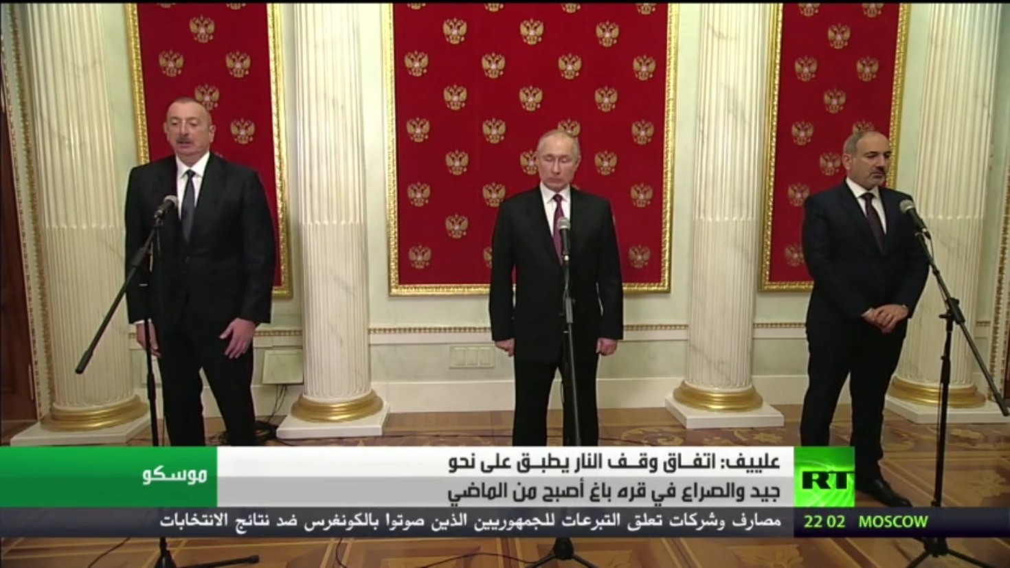 أعلن الرئيس الروسي فلاديمير بوتين في ختام مباحثاته بموسكو مع نظيره الأذربيجاني إلهام علييف ورئيس الوزراء الأرميني نيكول باشينيان أعلن توقيع اتفاق ثلاثي مشترك بشأن التنمية بقره باغ.