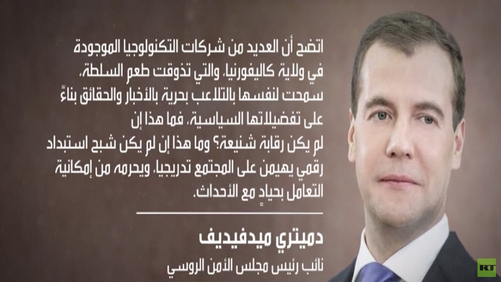 قال نائب رئيس مجلس الأمن الروسي /دميتري مدفيديف/ إن حجب حسابات الرئيس الأمريكي دونالد ترامب وأنصاره على مواقع التواصل الاجتماعي يعد رقابة محمومة واستبدادا رقميا حسب وصفه.