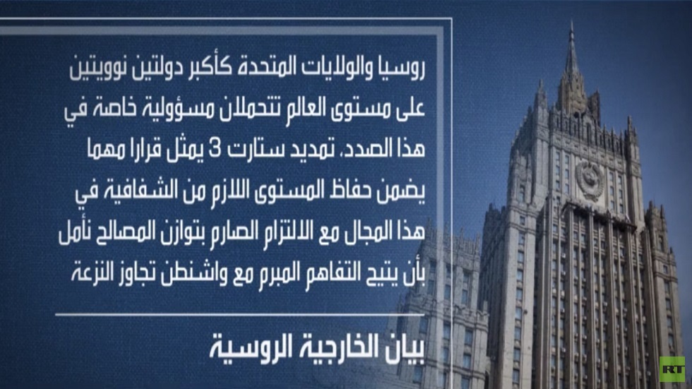 أعلنت الخارجية الروسية دخول تمديد معاهدة ستارت ثلاثة مع الولايات المتحدة لمدة خمس سنوات حيز التنفيذ اليوم. مضيفة أن موسكو مستعدة للعمل مع واشنطن لتعزيز الأمن العالمي والاستقرار.