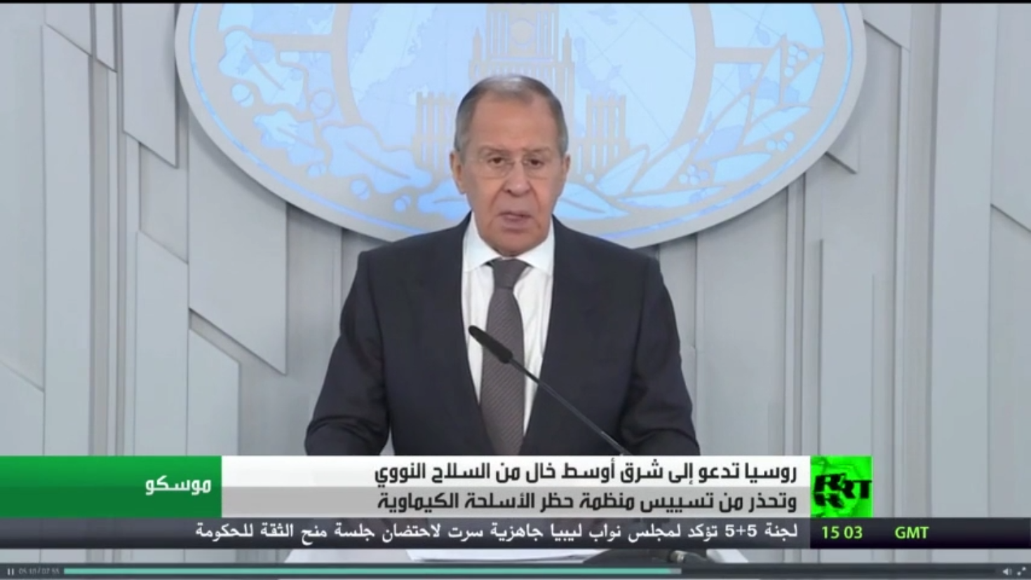 أكد وزير الخارجية الروسي سيرغي لافروف في كلمة أمام مؤتمر نزع السلاح المنعقد بجنيف..أكد ضرورة بحث إنشاء منطقة خالية من الأسلحة النووية والدمار الشامل في الشرق الأوسط.