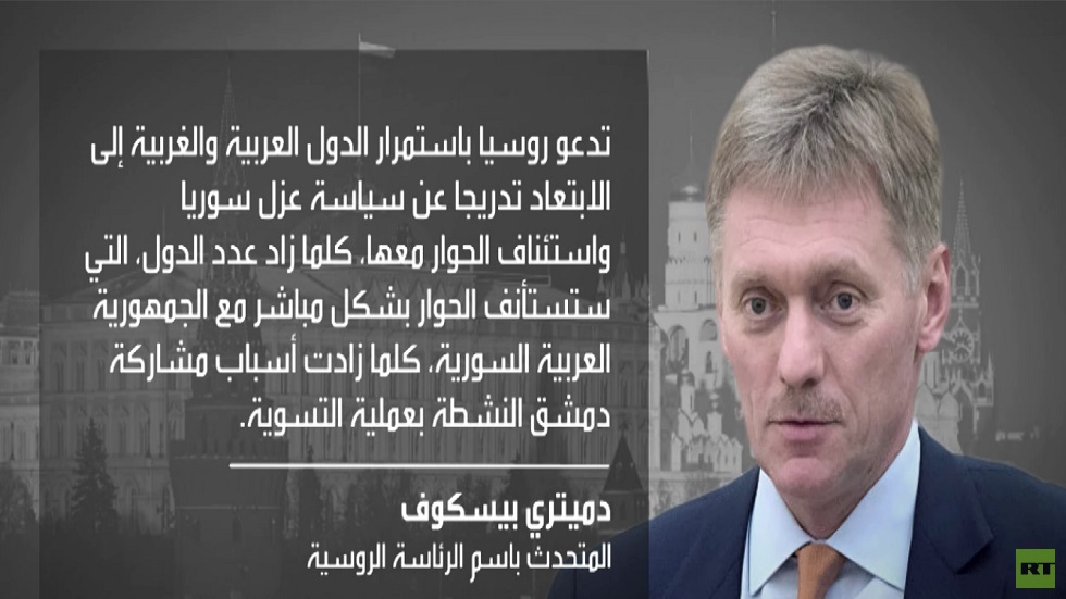 دعا المتحدث باسم الرئاسة الروسية /دميتري بيسكوف/ الدول العربية والغربية إلى الابتعاد عن سياسة عزل سوريا واستئناف الحوار معها.