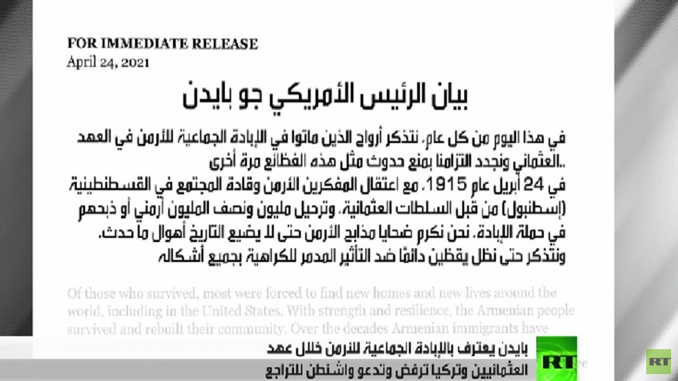 أعلن البيت الأبيض في بيان اعتراف الرئيس الأمريكي جو بايدن بصورة رسمية بتعرض الأرمن للإبادة الجماعية محملا مسئوليتها للإمبراطورية العثمانية.