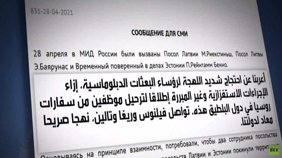 أعلنت وزارة الخارجية الروسية طرد سبعة دبلوماسيين يعملون بسفارات إستونيا ولاتفيا وليتوانيا وسلوفاكيا وذلك ردا على إجراء مماثل اتخذته تلك البلدان.
