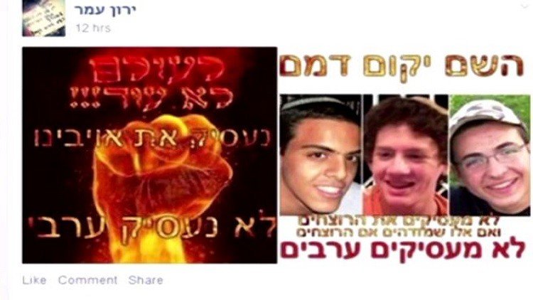 انشأ متطرفون إسرائيليون صفحات على مواقع التواصل الاجتماعي، تطالب بالانتقام من العرب. ونشرت صور لجنود رفعوا شعارات تدعو إلى الانتقام، أو في تعبيرات أخرى: "إبادة العرب".