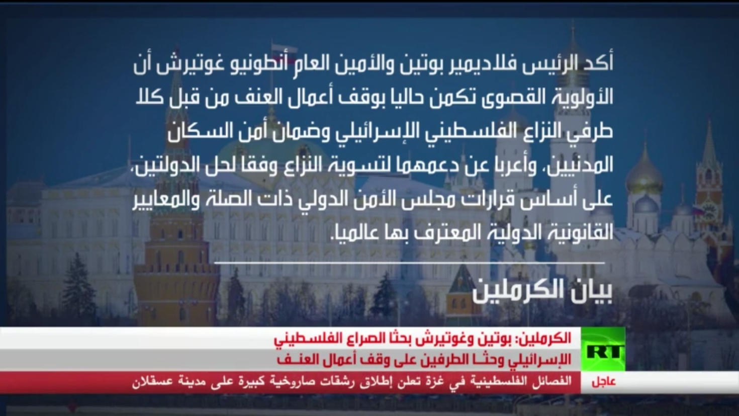 بحث الرئيس الروسي فلاديمير بوتين في اتصال مرئي مع الأمين العام للأمم المتحدة أنطونيو غوتيرش، الصراع الفلسطيني الإسرائيلي.