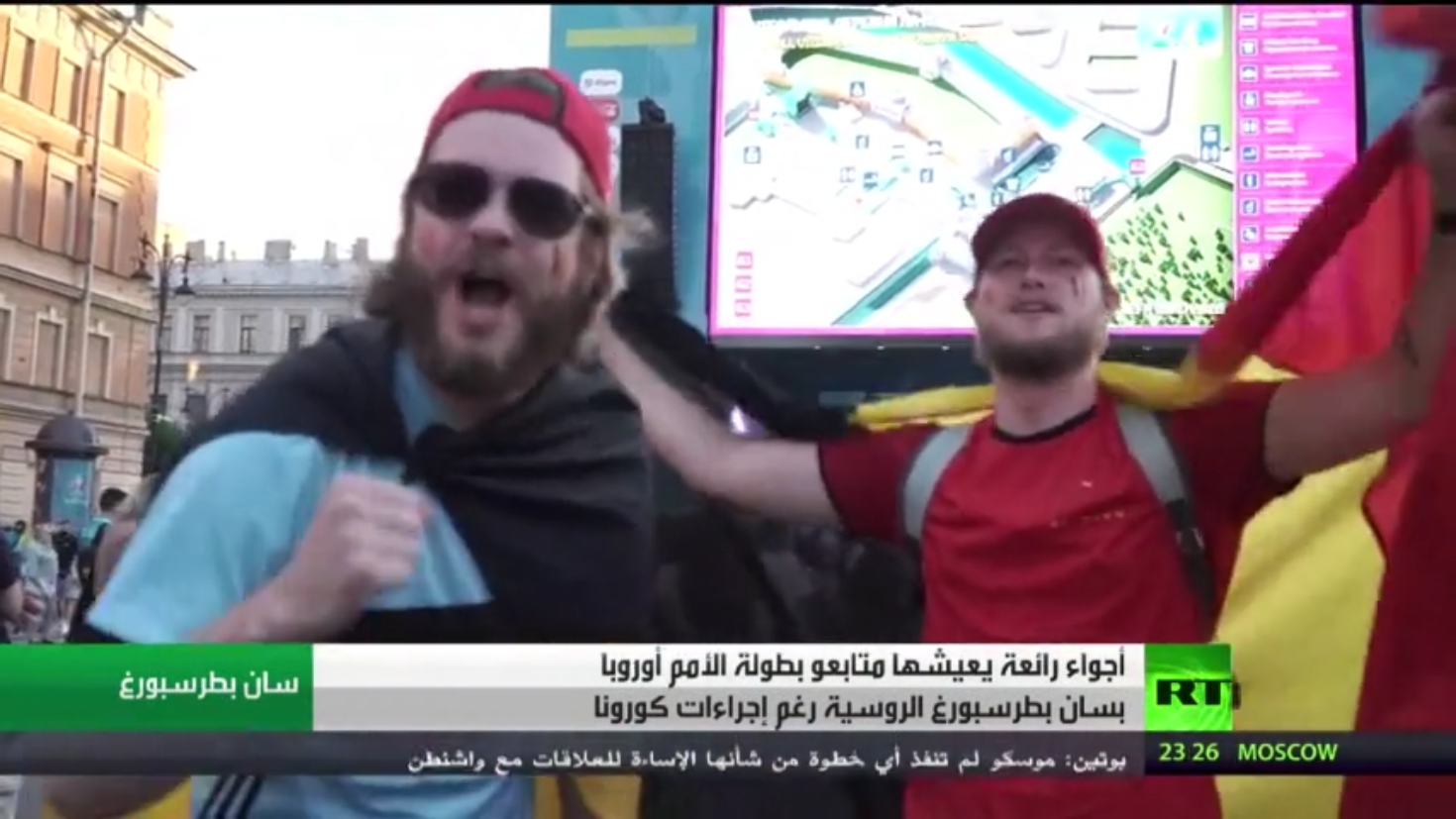 يمضي مشجعو كرة القدم أجواء رائعة في مدينة سان بطرسبورغ الروسية خلال متابعتهم مباريات كأس الأمم الأوروبية رغم إجراءات كورونا.