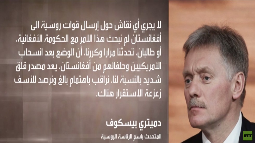 هذا وأعلن الكرملين في وقت سابق أن موسكو لم تناقش مع الحكومة الأفغانية أو مع حركة طالبان قضية إرسال قوات روسية إلى أفغانستان. مضيفا أن موسكو تشعر بمزيد من القلق بسبب تدهور الوضع وزعزعة الاستقرار في أفغانستان .