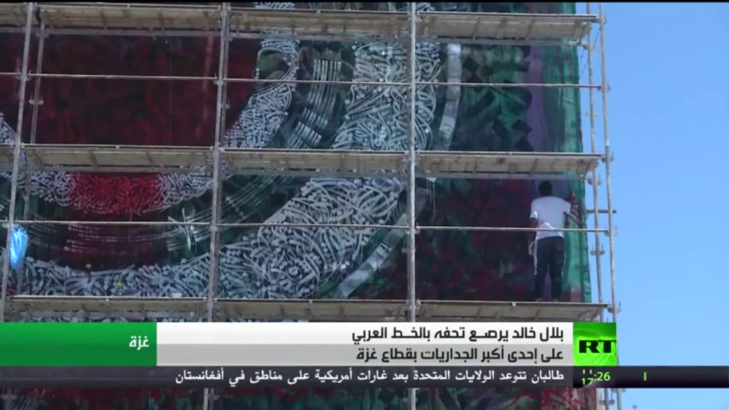 على إحدى أكبرِ الجدارياتِ الفنية بقطاع غزة، يبدع الفنان التشكيلي الفلسطيني بلال خالد في تحف ألوانها و هويتها الخط العربي..