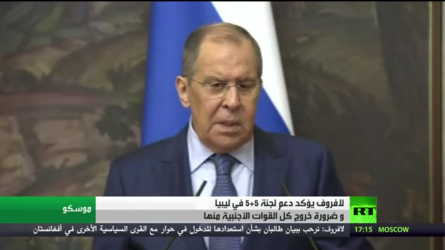 أكد وزير الخارجية الروسي سيرغي لافروف خلال لقائه وزيرة الخارجية الليبية نجلاء المنقوش ، أكد دعم مخرجات اللجنة العسكرية 5+5 ، و ضَرورة خروج كافة القوات الأجنبية من ليبيا.