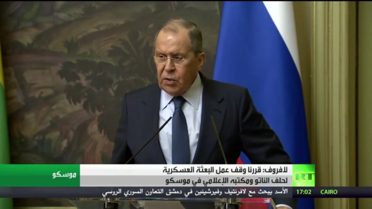 كما أعلن لافروف أن موسكو قررت وقف عمل البعثة العسكرية ومكتب الإعلام التابع للناتو في موسكو.
