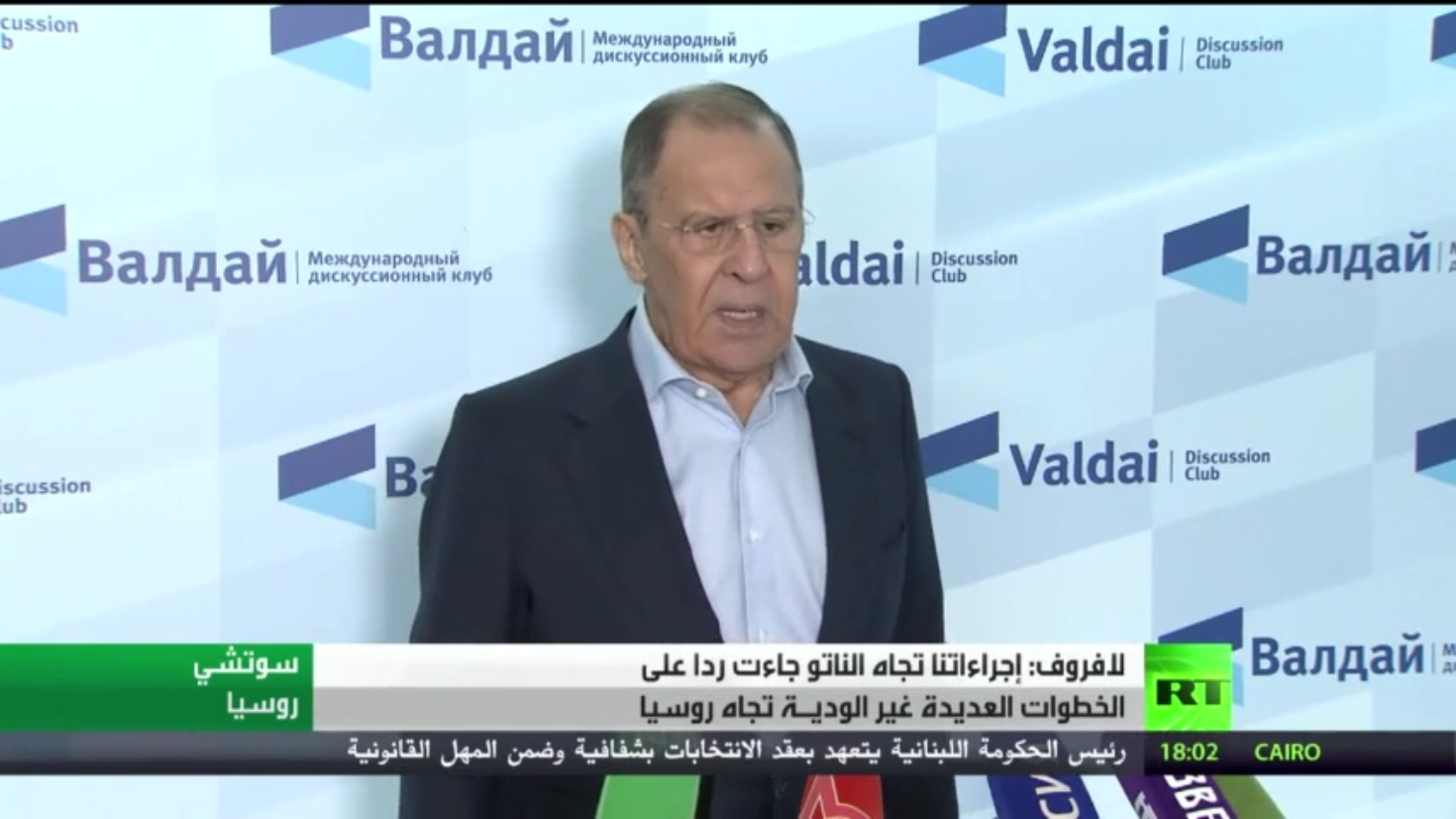 وأكد لافروف على هامش فعاليات منتدى فالداي في سوتشي أنّ إجراءات موسكو تجاه الناتو جاءت ردا على الخطوات غير الودية تجاه روسيا.