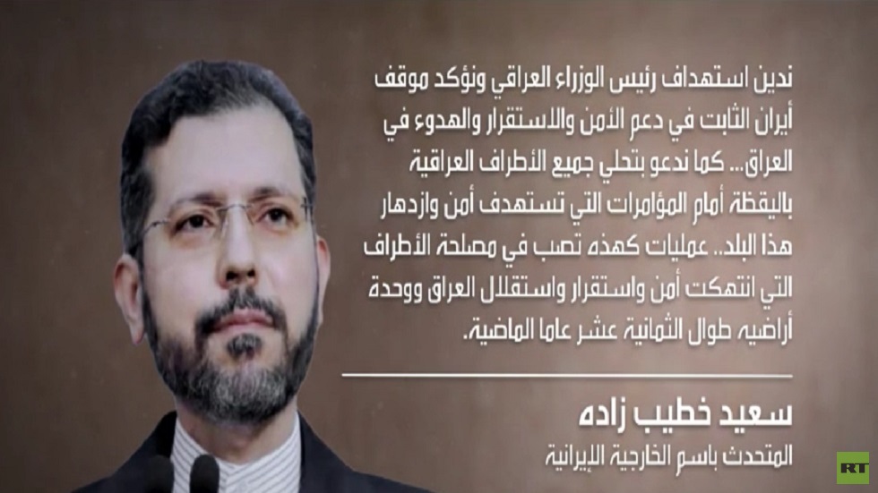أدانت الخارجية الإيرانية محاولة اغتيال رئيس الوزراء العراقي واعتبرتها تصب في مصلحة الأطراف التي احتلت العراق وانتهكت استقلاله وسلامة أراضيه لتحقيق أهداف وصفتها بالمشؤومة.