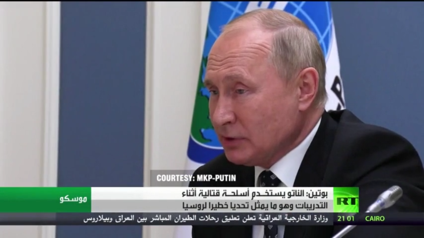 قال الرئيس الروسي فلاديمير بوتين في حديث لبرنامج موسكو - الكرملين- بوتين إن الولايات المتحدةَ وحلفاءها بالناتو، تستخدم الطيران المزود بالأسلحة القتالية خلال التدريبات بالبحر الأسود