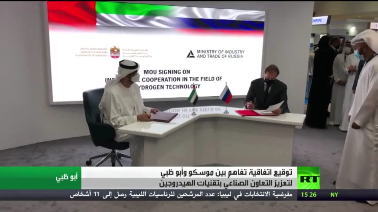 وقعت روسيا والإمارات اتفاقيةً لتعزيزِ التعاون الصناعي في تطوير تقنياتِ الهيدروجين، وذلك على هامش مؤتمر أبوظبي الدولي للبترول "أديبك 2021 "
