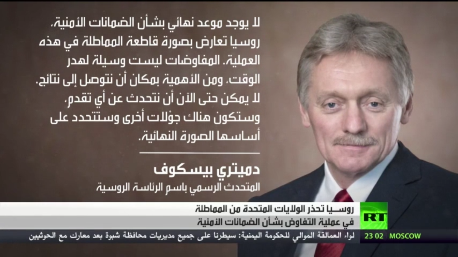 حذّر الكرملين واشنطن من المماطلة بعملية التفاوض بشأن الضمانات الأمنية.. وقال المتحدث باسم الرئاسة الروسية دميتري بيسكوف إن موسكو لم تلمس حتى الآن أي مؤشرات للتفاؤل.