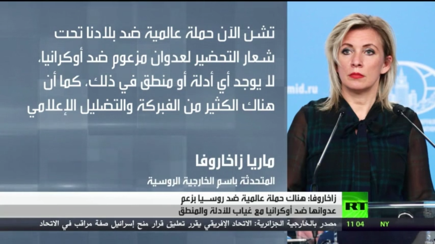 أكدت المتحدثة باسم الخارجية الروسية ماريا زاخاروفا أن حملة عالمية تُشن ضد روسيا تحت شعار التحضير لعدوان مزعوم على أوكرانيا وسط غياب للأدلة ، وعبر الفبركة والتضليل الإعلامي..