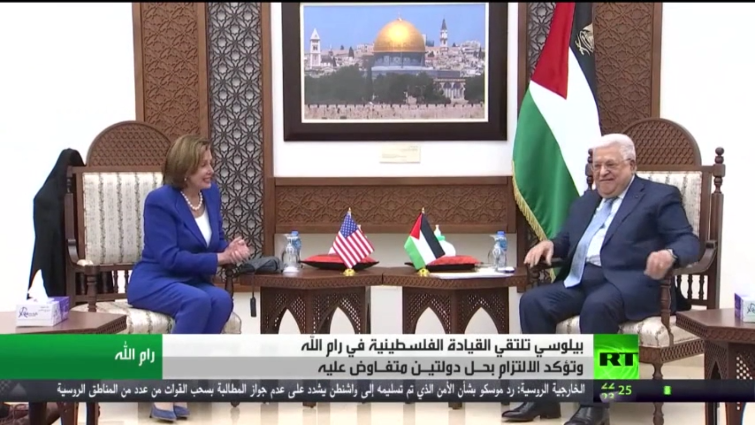 أكدت رئيسة مجلس النواب الأمريكي نانسي بيلوسي خلال زيارتها لرام الله التزام الولايات المتحدة الأمريكية بحل الدولتين والعمل على تعزيز الأمن والحرية والاستقرار للفلسطينيين والإسرائيلي