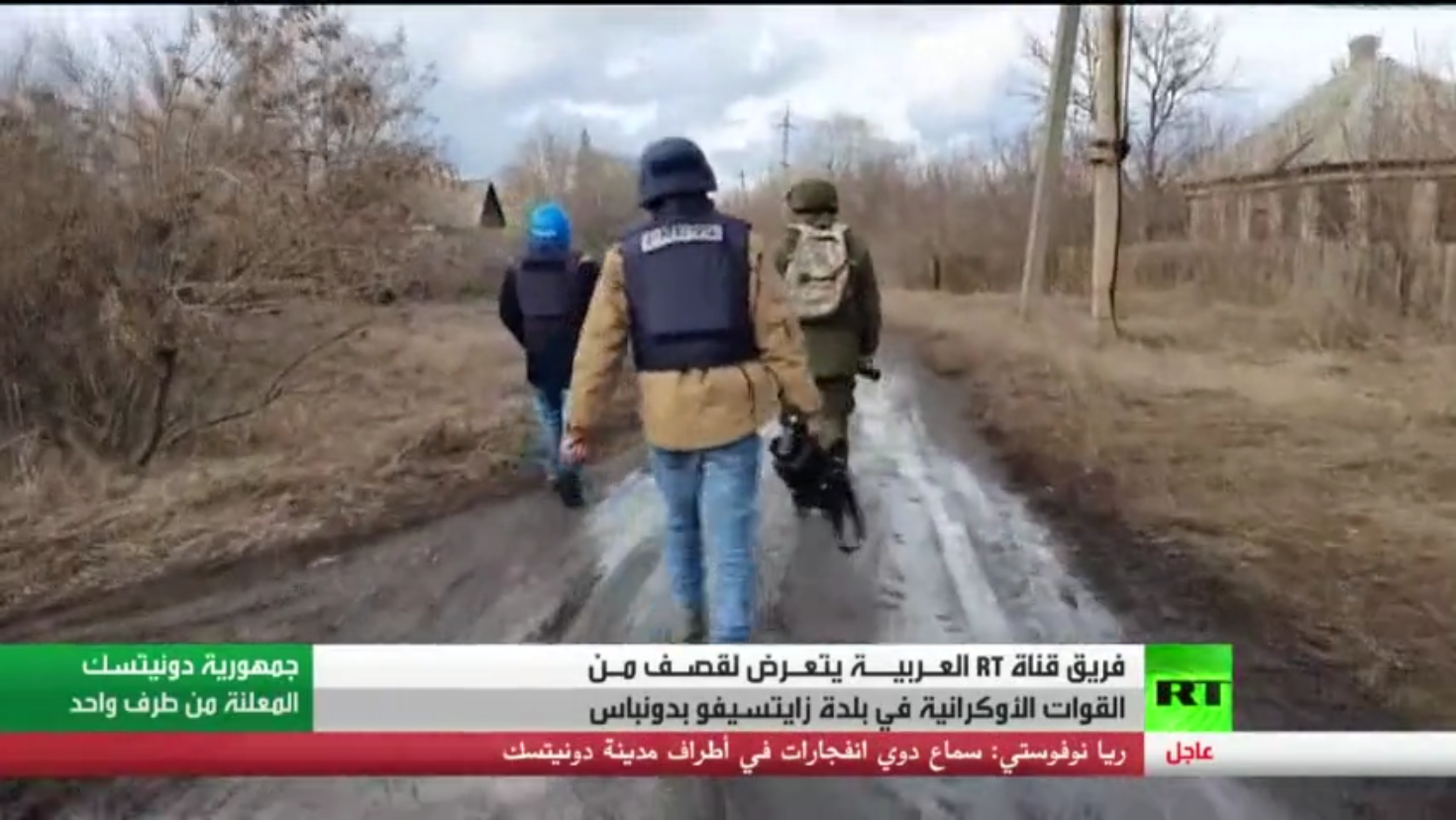 تعرض فريق قناة آر تي العربية لقصف من القوات الأوكرانية في بلدة /زايتسيفو/ بجمهورية دونيتسك الشعبية المعلنة من طرف واحد، وذلك خلال تغطيته تطورات الأوضاع في المنطقة.