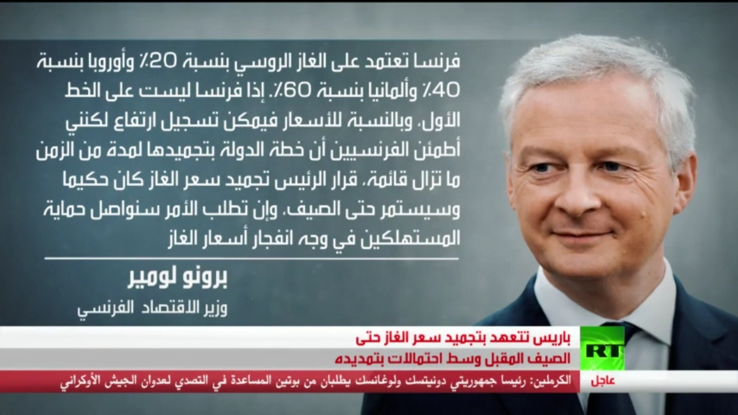 قال وزير الاقتصاد الفرنسي برونو لومير إن تجميد أسعار الغاز الذي تعتمده السلطات الفرنسية متواصل حتى الصيف.