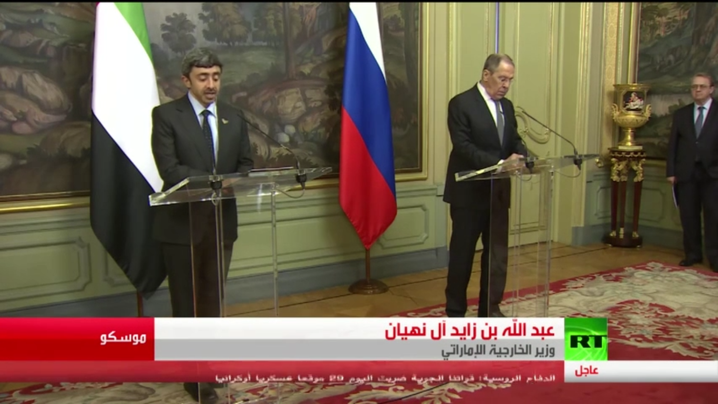أشاد وزير الخارجية الروسي سيرغي لافروف خلال مؤتمر صحافي مع نظيره الإماراتي عبد الله بن زايد، أشاد بتوازن موقف دولة الإمارات إزاءَ الوضع في أوكرانيا..