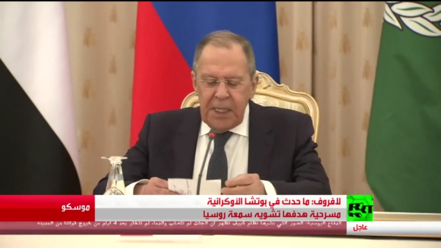قال وزير الخارجية الروسي، سيرغي لافروف، بختام مباحثاته مع وفد مجموعة الاتصال في جامعة الدول العربية إن الفيديوهات التي نشرتها أوكرانيا حول بوتشا مسرحية هدفها تشويه سمعة روسيا.