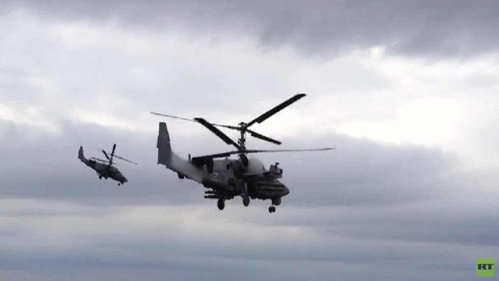 نشرت وزارة الدفاع الروسية لقطات للمروحيات الهجومية / كا - اثنان وخمسون/ وهي تقصف معدات عسكرية ومواقع مموهة للقوات الأوكرانية.