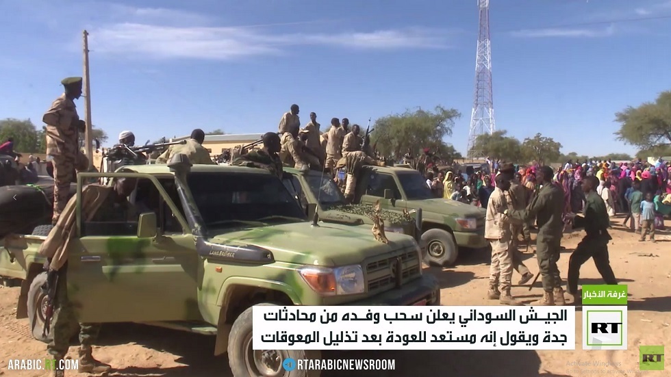 أعلن الجيش السوداني أن وفده في محادثات جدة السعودية عاد إلى السودان للتشاور.. وقال الجيش في بيان إن وفده مستعد لمواصلة مباحثات وقف إطلاق النار بعد تذليل المُعوِّقات.